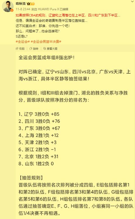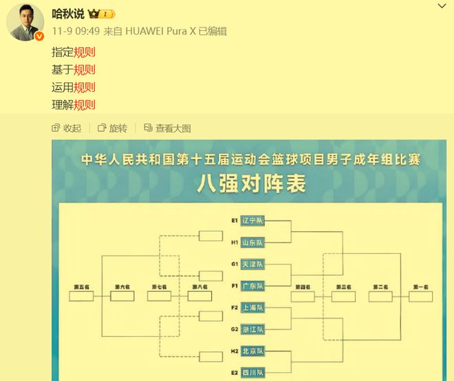 无独有偶,来自辽宁的知名篮球评论员哈秋,也不止一次通过个人社交媒体吐槽,说全运会的赛制很奇葩,半区落位竟然靠抽签。还暗讽,有人指定规则、基于规则、运用规则、理解规则。至于哈秋说的是谁,其实已经够直白了。