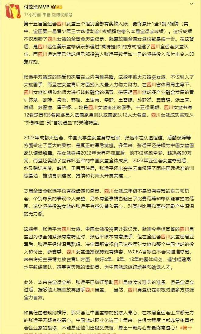 还有更猛的料在后面,根据体育媒体人付政浩的最新爆料,他说本来四川女篮的投资人张远平先生,在全运会开始前,本来已经做好了拉陷入困境的四川男篮一把的充分准备,但是由于四川女篮在全运会决赛负于广东女篮,在具备夺冠实力的情况下却未能如愿,因而让张老板极其失望和寒心,所以他可能不会再考虑接手四川男篮。
