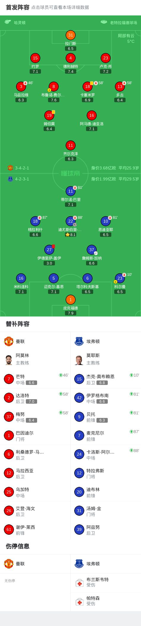 第88分钟,埃弗顿换人,格拉利什和霍尔被换下
