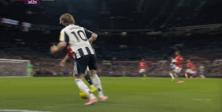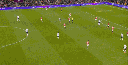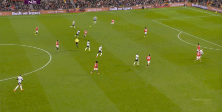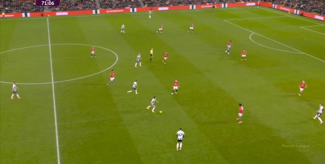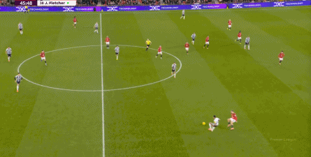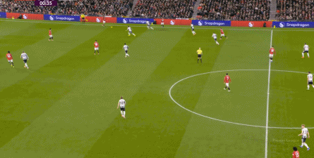 反倒是在曼联这边,通过海文的直传,多尔古和位居中路的芒特依旧可以打出配合,从而能把压力释放出去,打到纽卡斯尔的身上: